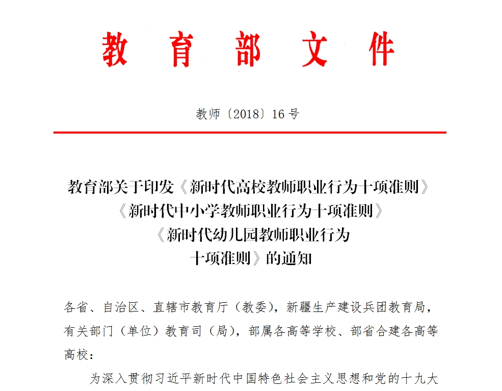 為深入貫徹習(xí)近平新時代中國特色社會主義思想和黨的十九大精神,深入貫徹落實(shí)全國教育大會精神,扎實(shí)推進(jìn)《中共中央 國務(wù)院關(guān)于全面深化新時代教師隊(duì)伍建設(shè)改革的意見》的實(shí)施,進(jìn)一步加強(qiáng)師德師風(fēng)建設(shè),我部研究制定了《新時代高校教師職業(yè)行為十項(xiàng)準(zhǔn)則》《新時代中小學(xué)教師職業(yè)行為十項(xiàng)準(zhǔn)則》《新時代幼兒園教師職業(yè)行為十項(xiàng)準(zhǔn)則》(以下統(tǒng)稱準(zhǔn)則)。現(xiàn)印發(fā)給你們,請結(jié)合實(shí)際,認(rèn)真貫徹執(zhí)行。