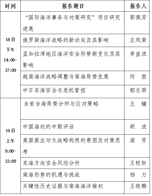 會議地點:中國海洋大學嶗山校區圖書館第一會議室。 本次會議向海大教師開放,同時歡迎海洋資源與權益綜合管理等相關專業的碩士、博士研究生參加。請登錄中國海洋發展研究中心秘書處網站(http://web.ouc.edu.cn/aoc/)在線報名。報名截止時間:3月16日下午17:00。 聯系人:張士洋 王倩 聯系電話:0532-82031177 0532-82031178 中國海洋發展研究中心秘書處 海洋與大氣學院 2018年3月13日 附:報告專家簡介(按姓氏筆畫排序,排名不分先后) 一、王校軒 海軍軍事學術研究所原所長、研究員、少將。研究方向:海洋安全與海軍戰略。主要成果:《我國海洋安全研究》、《經略南海研究》、《海上積極防御戰略》等。 二、王曉鵬 中國社會科學院中國邊疆研究所副研究員,長期充實中國海疆問題、海權維護、南海問題、東海問題等方面的研究。主要成果:《南海歷史地圖與菲律賓南海仲裁案關系報告》、《美菲頻繁調研造勢我宜分步應對把握主動權》、《中國對南海諸島主權的關鍵性歷史依據與戰略選擇》等。 三、王鍵 中國社會科學院近代史研究所首席研究員、中國社會科學院大學教授。研究方向:東亞關系史研究。主要成果:《日本企業集團的形成與發展》、《戰后日臺經濟關系的演變軌跡》、《戰后美日臺關系史研究(1945-1995)》等。 四、左鳳榮 中共中央黨校國際戰略研究院國際政治研究室主任、教授、博導,享受國務院特殊津貼專家。主要成果:《俄羅斯海洋戰略初探》、《俄羅斯海洋戰略對中國的借鑒與啟示》、《俄羅斯海洋戰略的新變化》、《重振俄羅斯——普京的對外戰略與外交政策》等。 五、李益波 北京印刷學院社科部副教授,中國南海研究院兼職研究員,長期從事海洋安全及大國海洋戰略等方面的研究。主要成果:《美國北極戰略新動向及其國際影響》、《英國北極政策研究》、《印度莫迪政府南海政策的新動向及對策》、《化危為機:構建南海爭端解決機制,塑造“新海絲”建設穩定環境》等。 六、楊力 中國南海研究院研究員。先后在外交部條約法律司、邊界海洋事務司從事海洋法和南海、東海等方面研究工作,并曾在中國常駐聯合國代表團任職。 七、何勝 對外經濟貿易大學東盟國家研究中心主任,長期從事中國周邊海洋安全與合作、南海問題、越南內政外交和中越關系等方面的研究。主要成果:《關于建設海洋強國的若干戰略思考》、《“21世紀海上絲綢之路”與中國-東盟關系:機遇、風險與應對思考》等。 八、郁志榮 中國海監東??傟犜崭笨傟犻L,在職期間參加了“中日黑潮聯合調查”,帶隊登檢美國海洋調查船“羅杰”號,參加“中國海監船編隊釣魚島海域12.8巡航執法”。主要成果:《海洋維權與海洋法律》、《東海維權——中日釣魚島之爭》等。 九、胡波 北京大學海洋戰略研究中心執行主任、北京大學海洋研究院研究員。長期從事外交政策及軍事戰略等方面的研究,主要成果:《中美在西太平洋的軍事競爭與戰略平衡》、《中國海權策:外交、海洋經濟及海上力量》(2012)、《2049年的中國海上權力》(2015)等。 十、郭佩芳 中國海洋大學教授、博導,海洋資源與權益綜合管理學科點負責人。研究方向:海洋綜合管理。主要成果:《美國海上合作戰略對中國的影響及其對策研究》、《我國南海無居民海島的行政建制研究》、《海洋主體功能區劃規劃基礎理論研究》等。 十一、梁芳 國防大學國家安全學院教授,長期從事國家安全戰略、軍事戰略、海軍戰略、海洋權益與國家安全等領域的教學與研究。主要成果:《海上戰略通道論》、《海戰史與未來海戰研究》及《東海方向軍事斗爭戰略問題研究》等。 |