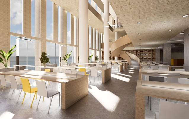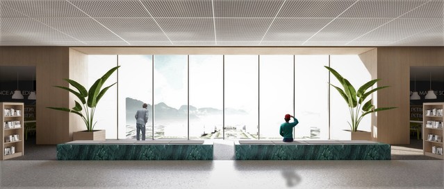 學(xué)習(xí)綜合體“夢(mèng)想之舟”效果圖 亮點(diǎn)5:“海之嶺”“海之丘”“海之壑”的主題定義 方案將學(xué)習(xí)綜合體主樓西向觀山區(qū)定義為“海之嶺”,設(shè)置觀山休憩、圍合閱覽及冥想?yún)^(qū);將東向望海區(qū)上層偏廳定義為“海之丘”,下層偏廳定義為“海之壑”,呼應(yīng)建筑立面,強(qiáng)化中部的視線貫通,形成開(kāi)闊閱覽空間。 在主題空間的設(shè)計(jì)上,通過(guò)對(duì)建筑內(nèi)立面裝飾語(yǔ)言、家具高度布置的把控,將室內(nèi)空間水平延展,烘托自由、通透、色彩明亮輕快的空間場(chǎng)所,莘莘學(xué)子沉浸其中,暢游知識(shí)海洋。