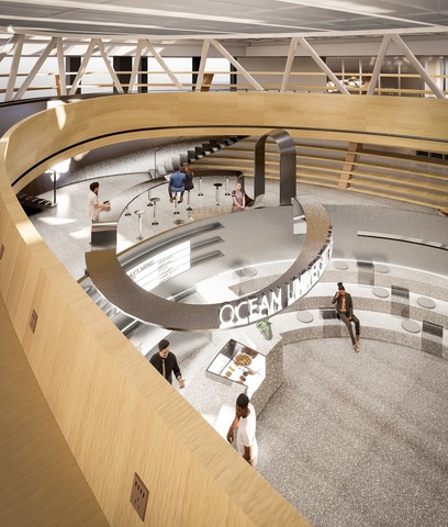 學(xué)習(xí)綜合體功能布局圖 學(xué)習(xí)綜合體精裝方案在滿足共性需求之上,圍繞海洋文化特色,從學(xué)生體驗(yàn)出發(fā),渲染中國(guó)海洋大學(xué)校園精神的個(gè)性價(jià)值。以靈活可變的空間,激發(fā)更為自主的思考行為;以豐富多樣的空間,鼓勵(lì)舒適便捷的學(xué)習(xí)行為;以去權(quán)威化的空間,促成積極的交流與表達(dá);以智能友好化的空間,傳遞對(duì)人的貼心關(guān)懷。 亮點(diǎn)1:呼應(yīng)海洋主題的整體設(shè)計(jì)理念 方案設(shè)計(jì)靈感受啟發(fā)于廣袤海洋平面下變化奇特的海底地貌,其間蘊(yùn)藏的勃勃生機(jī)和無(wú)盡可能,宛如無(wú)數(shù)學(xué)子所追尋的浩瀚無(wú)盡的知識(shí)世界。方案呼應(yīng)海洋主題,將內(nèi)部移動(dòng)的人流,類比海平面下涌動(dòng)的海流,通過(guò)不同空間個(gè)性化設(shè)計(jì),引導(dǎo)使用者步行流線,使整個(gè)空間活化而有生機(jī)。 亮點(diǎn)2:統(tǒng)一性、豐富性、易識(shí)別性的空間設(shè)計(jì)原則 鑒于超尺度建筑體量,方案通過(guò)材質(zhì)、色調(diào)的把握,保證空間統(tǒng)一性;以木色搭配灰白形成莊重典雅的基調(diào),通過(guò)調(diào)節(jié)色彩明暗、局部引入明亮彩色,契合不同功能分區(qū)的豐富性;設(shè)置清晰且有特色的標(biāo)識(shí)系統(tǒng),將校園文化融入其中,實(shí)現(xiàn)使用者的快速定位。 亮點(diǎn)3:獨(dú)具特色的中庭空間 學(xué)習(xí)綜合體主樓中庭,利用層層退級(jí),形成具有較高辨識(shí)度的豐富立體“Y”字型開(kāi)放空間,同時(shí)最大程度消除高樓層帶來(lái)的安全隱患。頂部“夢(mèng)想之舟”懸掛于中庭上空,結(jié)合頂部自然光線,營(yíng)造溫暖陽(yáng)光灑入海中峽谷的意境,將整個(gè)中庭空間塑造成美妙的“海底世界”。
