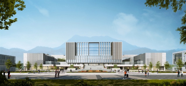 學(xué)習(xí)綜合體鳥(niǎo)瞰圖 為保證學(xué)習(xí)綜合體與校園環(huán)境的整體協(xié)調(diào)性,采用不同設(shè)計(jì)手法對(duì)學(xué)習(xí)綜合體立面進(jìn)行個(gè)性化處理。南北立面虛實(shí)結(jié)合,引入兩側(cè)“山海通廊”景觀;西立面嚴(yán)整對(duì)稱,打造厚重莊嚴(yán)的氛圍,與古典、近代區(qū)建筑風(fēng)格遙相呼應(yīng);東立面現(xiàn)代靈動(dòng),構(gòu)建開(kāi)闊觀景視野,與校區(qū)東側(cè)現(xiàn)代區(qū)風(fēng)格及瀕海景觀形成互動(dòng)。