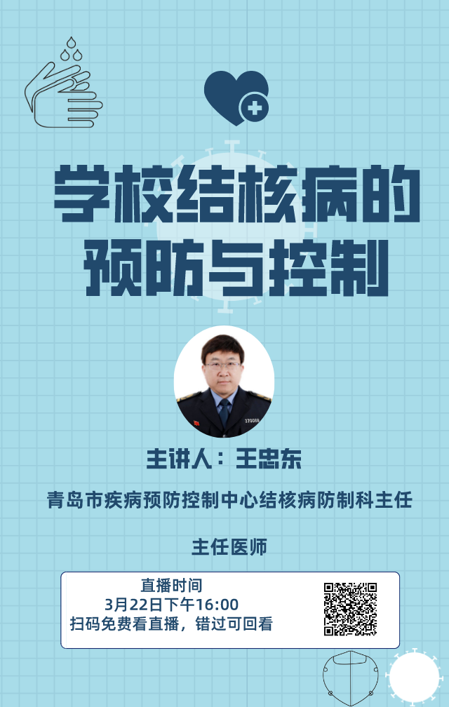 全校師生: 2021年3月24日是第26個世界防治結核病日,今年我國的宣傳主題是“終結結核流行,自由健康呼吸”。為宣傳學校結核病防控知識,青島市疾病預防控制中心結核病防治科王忠東主任醫師將在3月22日16:00進行《學校結核病的預防與控制》的在線講座,請各位師生積極參加。參與方式請掃描下方圖片中的二維碼進行觀看直播或回放。