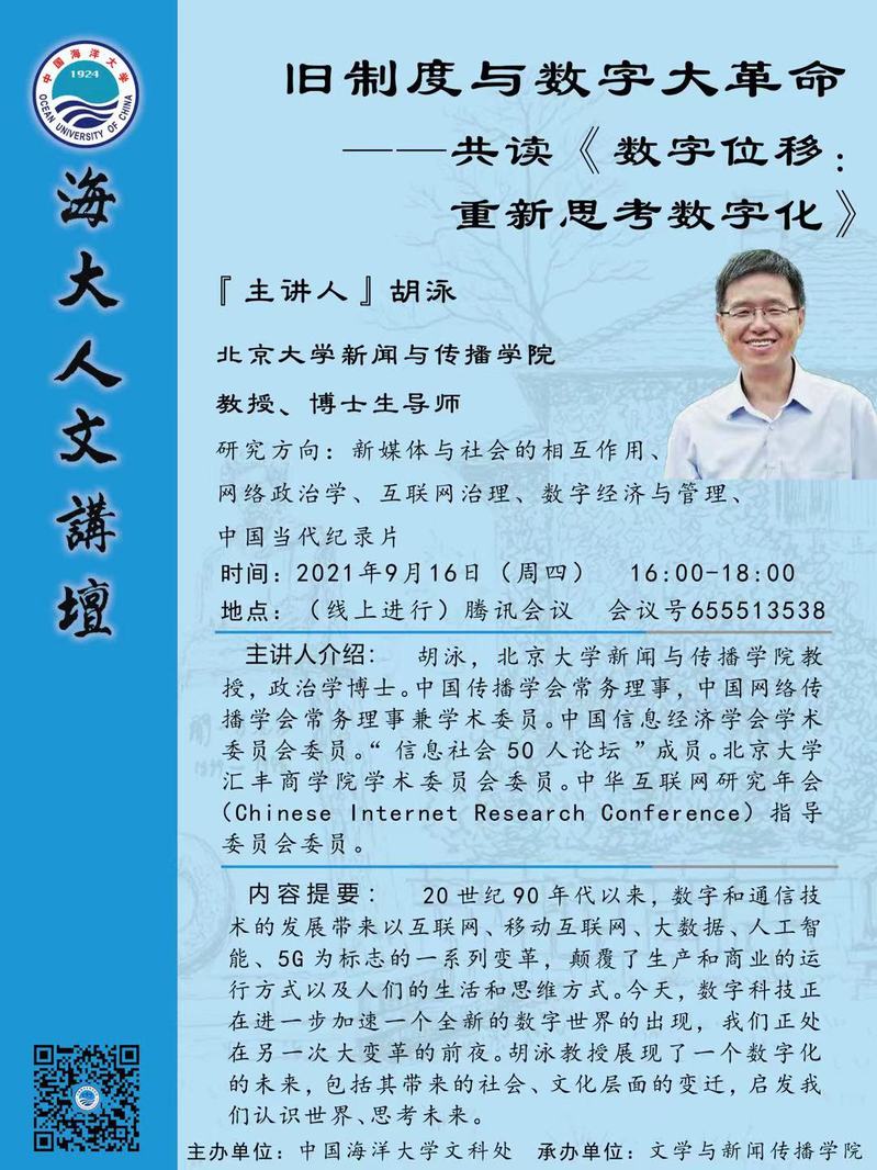 海大人文講壇2021年第65講-胡泳:舊制度與數(shù)字大革命——共讀《數(shù)字位移:重新思考數(shù)字化》
