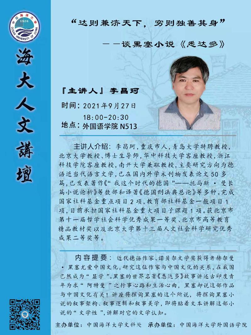 海大人文講壇2021年第66講-李昌珂:“達則兼濟天下,窮則獨善其身”——談黑塞小說《悉達多》