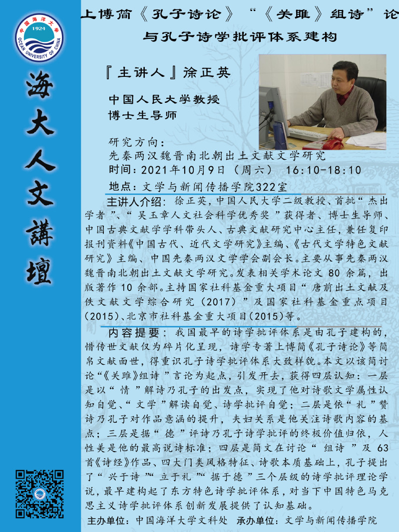 海大人文講壇2021年第67講-徐正英:上博簡《孔子詩論》“《關雎》組詩”論與孔子詩學批評體系建構