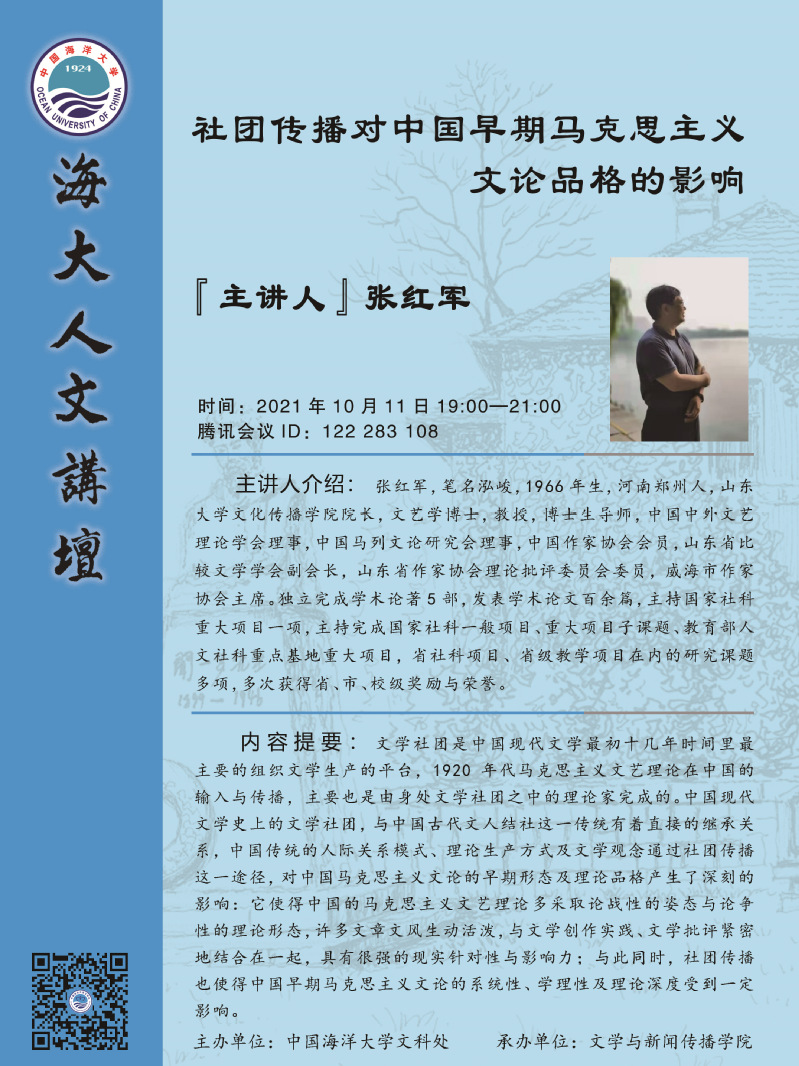 海大人文講壇2021年第69講-張紅軍:社團傳播對中國早期馬克思主義文論品格的影響