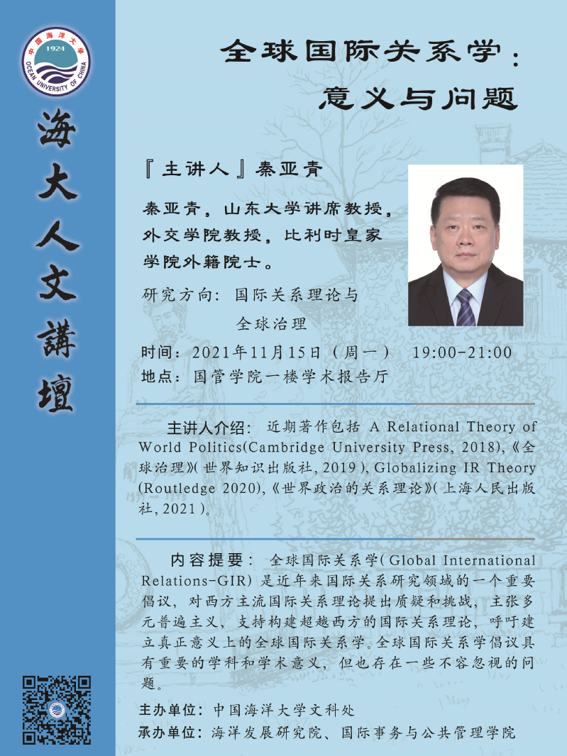 海大人文講壇2021年第89講-秦亞青:全球國際關系學:意義與問題