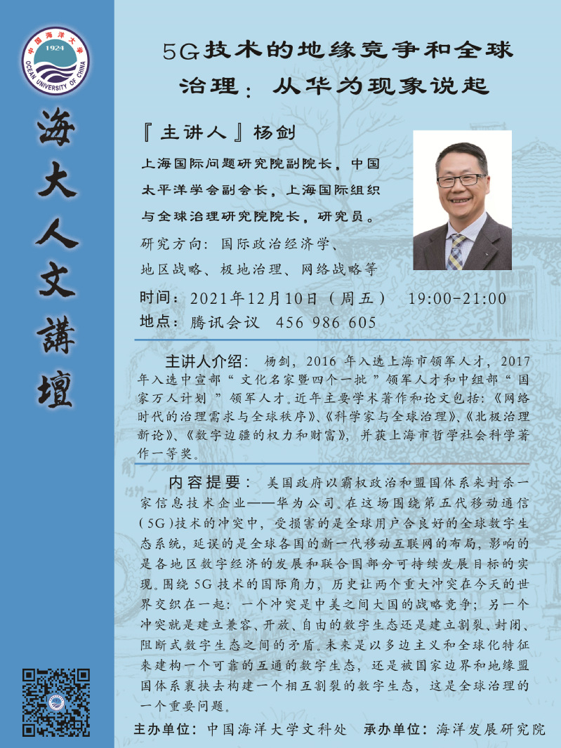 海大人文講壇2021年第99講-楊劍:5G技術的地緣競爭和全球治理:從華為現象說起