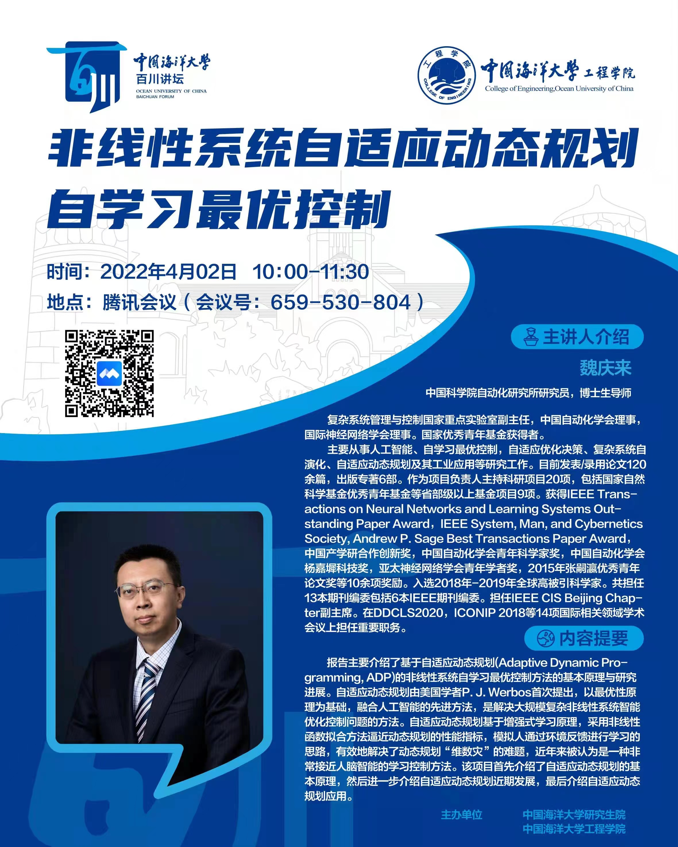 研究生百川講壇第158講-魏慶來:非線性系統自適應動態規劃自學習最優控制