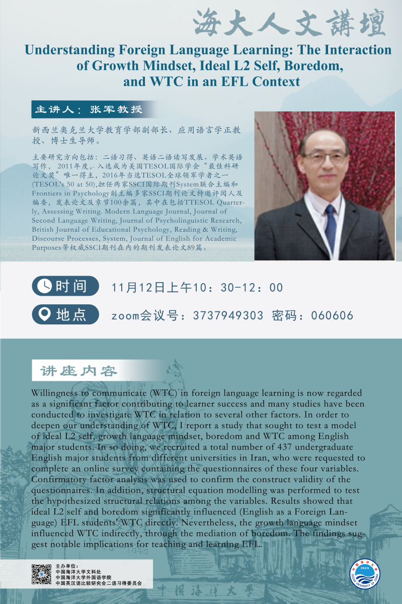 海大人文講壇2022年第20講-張軍:Understanding Foreign Language Learning: The Interaction of Growth Mindset, Ideal L2 self, Boredom, and WTC in an EFL Context