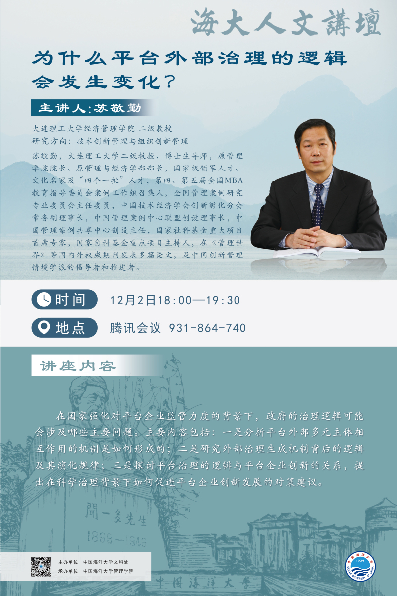海大人文講壇2022年第29講-蘇敬勤:為什么平臺外部治理的邏輯會發生變化?