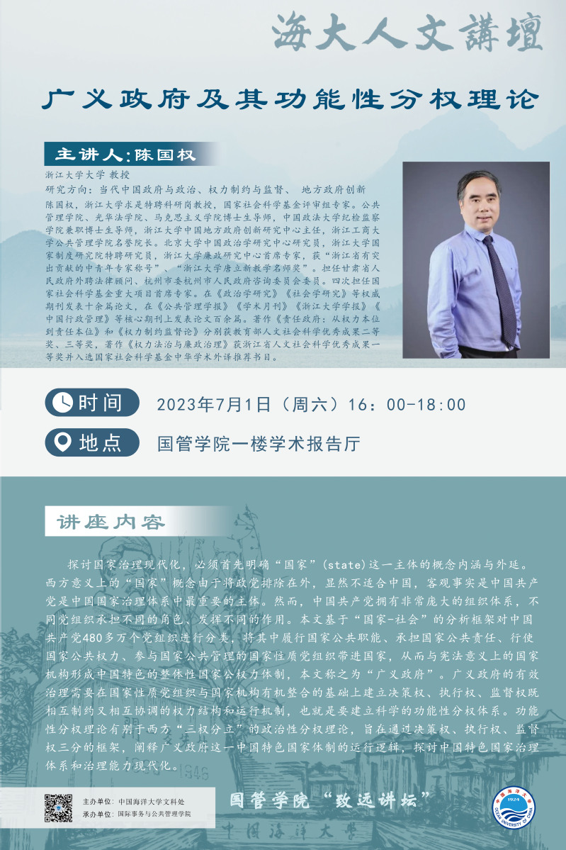 海大人文講壇2023年第52講-陳國權:廣義政府及其功能性分權理論
