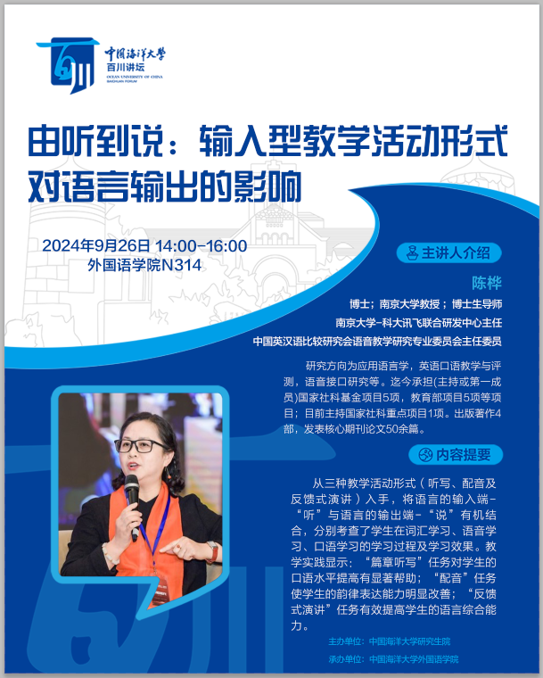 研究生百川講壇第373講-陳樺:由聽到說:輸入型教學(xué)活動(dòng)形式對(duì)語言輸出的影響
