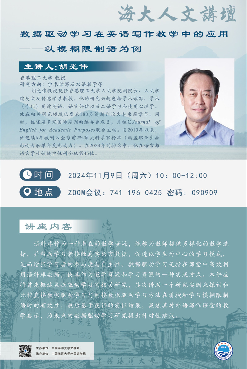 海大人文講壇2024年第84講-胡光偉:數(shù)據(jù)驅(qū)動(dòng)學(xué)習(xí)在英語(yǔ)寫(xiě)作教學(xué)中的應(yīng)用 一一以模糊限制語(yǔ)為例