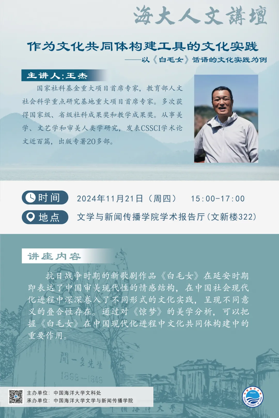 海大人文講壇2024年第89講-王杰:作為文化共同體構(gòu)建工具的文化實(shí)踐-以《白毛女》話語的文化實(shí)踐為例