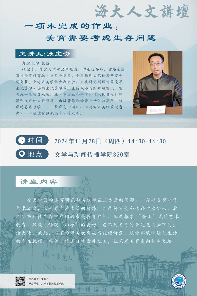 海大人文講壇2024年第94講-張寶貴:一項未完成的作業(yè):美育需要考慮生存問題