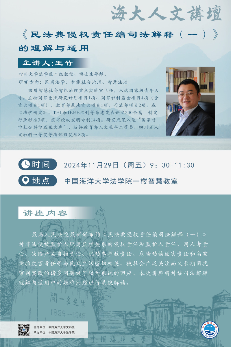 海大人文講壇2024年第95講-王竹:《民法典侵權責任編司法解釋(一)》的理解與適用