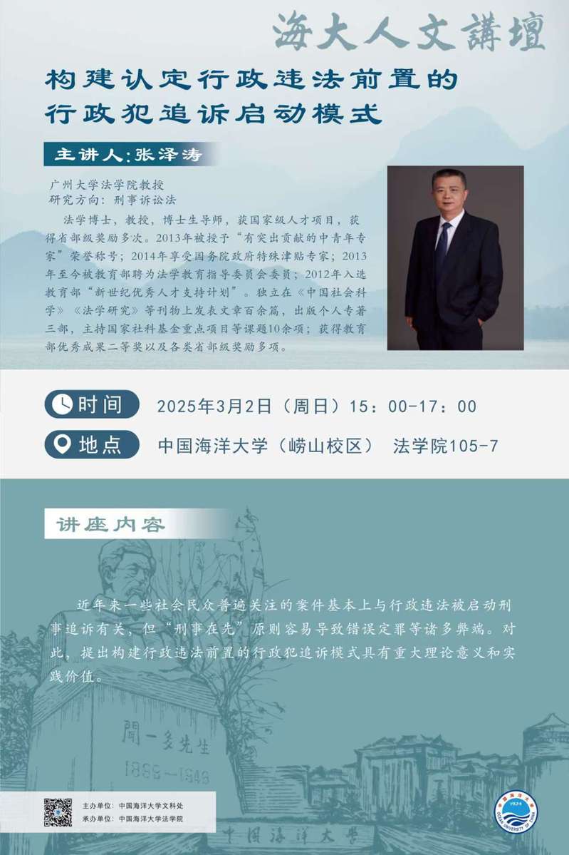 海大人文講壇2025年第5講-張澤濤:構建認定行政違法前置的行政犯追訴啟動模式