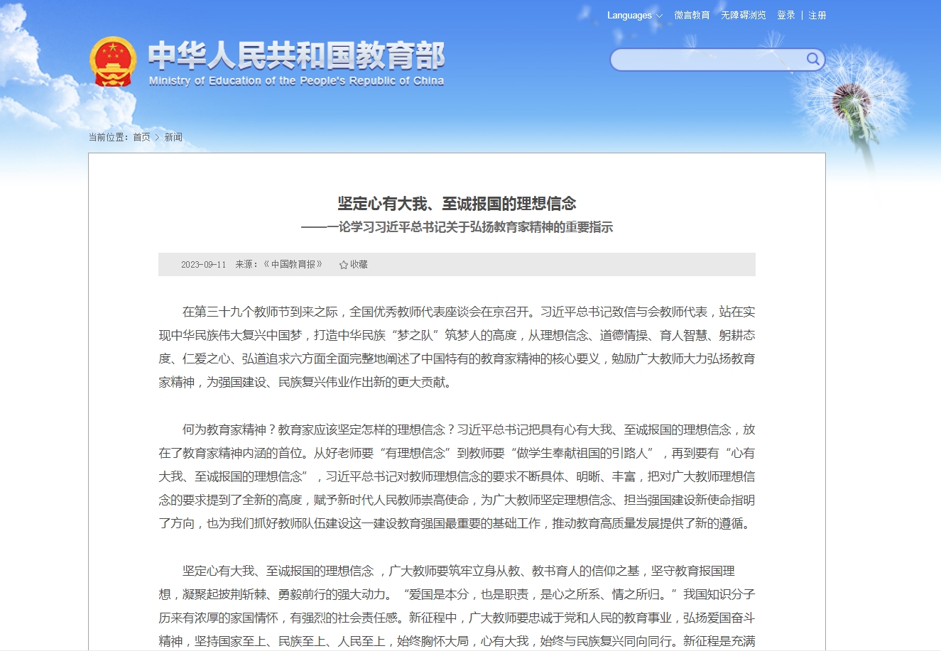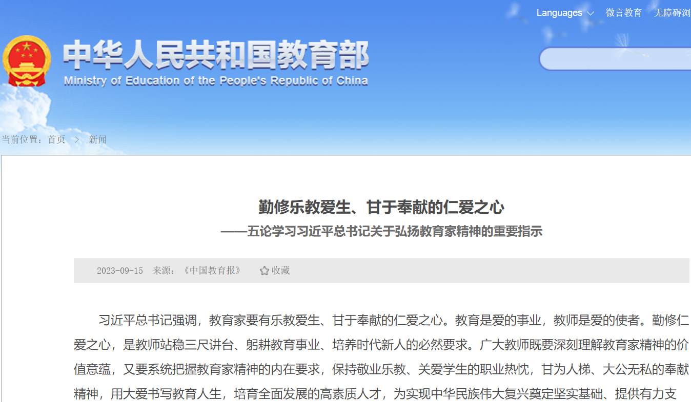 • 在第三十九個教師節到來之際,全國優秀教師代表座談會在京召開。習近平總書記致信與會教師代表,站在實現中華民族偉大復興中國夢,打造中華民族“夢之隊”筑夢人的高度,從理想信念、道德情操、育人智慧、躬耕態度、仁愛之心、弘道追求六方面全面完整地闡述了中國特有的教育家精神的核心要義,勉勵廣大教師大力弘揚教育家精神,為強國建設、民族復興偉業作出新的更大貢獻。