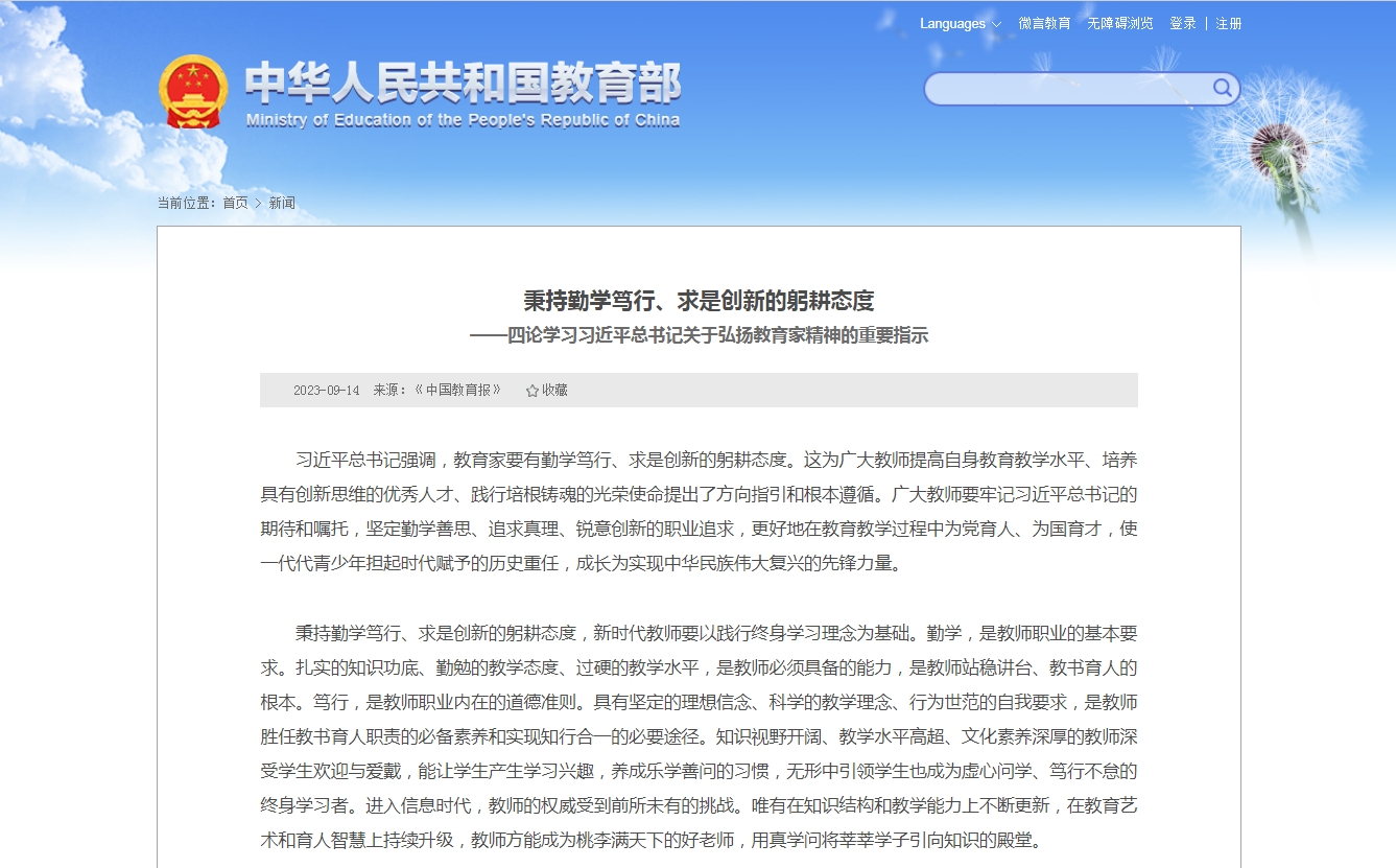 • 習近平總書記強調,教育家要有勤學篤行、求是創新的躬耕態度。這為廣大教師提高自身教育教學水平、培養具有創新思維的優秀人才、踐行培根鑄魂的光榮使命提出了方向指引和根本遵循。廣大教師要牢記習近平總書記的期待和囑托,堅定勤學善思、追求真理、銳意創新的職業追求,更好地在教育教學過程中為黨育人、為國育才,使一代代青少年擔起時代賦予的歷史重任,成長為實現中華民族偉大復興的先鋒力量。