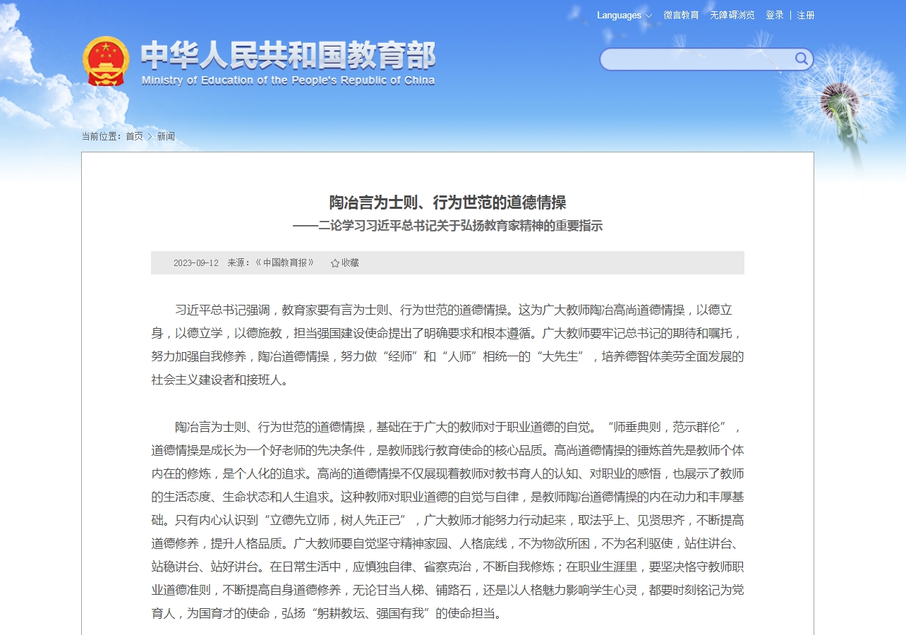 • 習近平總書記強調,教育家要有言為士則、行為世范的道德情操。這為廣大教師陶冶高尚道德情操,以德立身,以德立學,以德施教,擔當強國建設使命提出了明確要求和根本遵循。廣大教師要牢記總書記的期待和囑托,努力加強自我修養,陶冶道德情操,努力做“經師”和“人師”相統一的“大先生”,培養德智體美勞全面發展的社會主義建設者和接班人。