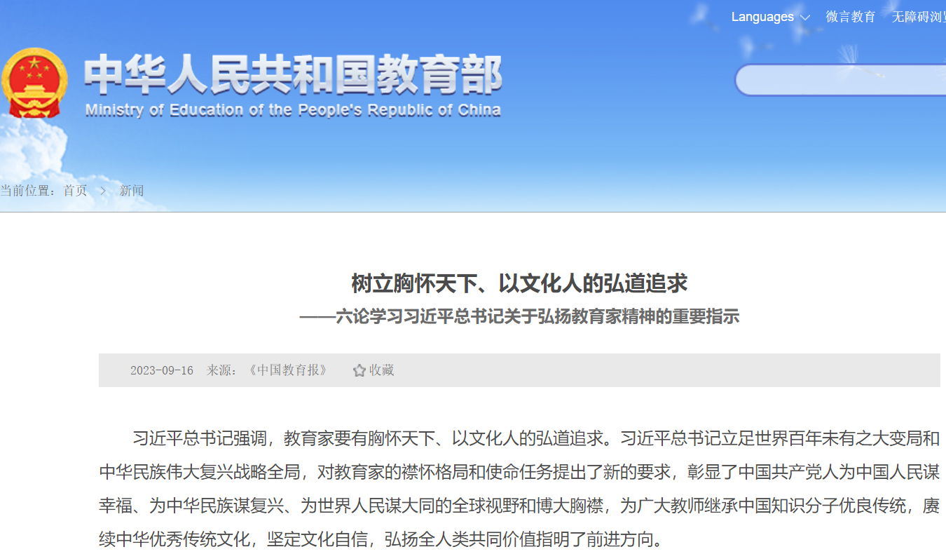 •   習近平總書記強調,教育家要有胸懷天下、以文化人的弘道追求。習近平總書記立足世界百年未有之大變局和中華民族偉大復興戰略全局,對教育家的襟懷格局和使命任務提出了新的要求,彰顯了中國共產黨人為中國人民謀幸福、為中華民族謀復興、為世界人民謀大同的全球視野和博大胸襟,為廣大教師繼承中國知識分子優良傳統,賡續中華優秀傳統文化,堅定文化自信,弘揚全人類共同價值指明了前進方向。