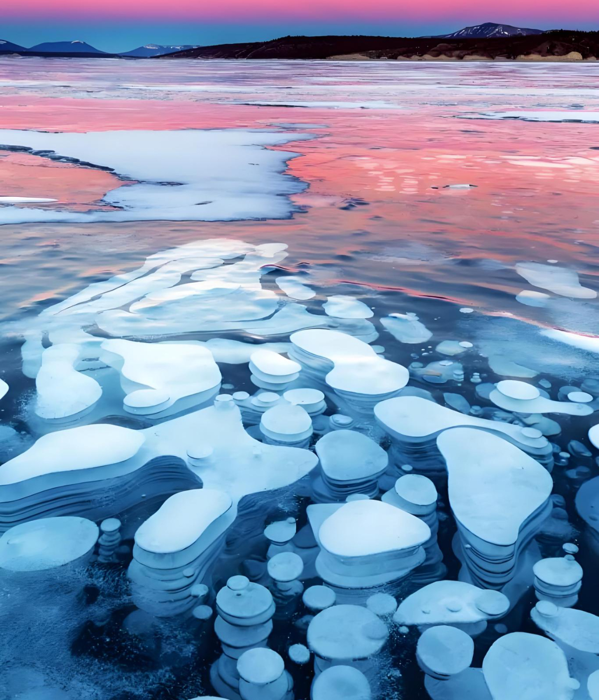 •   亞伯拉罕湖位于加拿大艾伯塔省,以其冬季特有的氣泡冰景觀聞名遐邇。遠遠望去,湖面上覆蓋著一層透明的冰層,透過冰面可以看到無數個大小不一的氣泡被凍結在其中,宛如一個個時間膠囊。